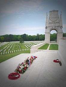 Designed by Sir Edwin Lutyens, Étaples Military Cemetery is the largest CWGC cemetery in France,[1] and contains the remains of soldiers from the United Kingdom, Canada, Australia, New Zealand, South Africa, India and Germany.[2] The Commonwealth War Graves Commission has only published the number of Commonwealth and German dead buried in Étaples, although its records for the cemetery note that it contains 'a few war graves of other nationalities'.[1]