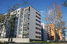 The new residential housing in the microdistrict consisted almost exclusively of five-story prefabricated concrete block apartment buildings popularly known as khrushchyovkas. Three nine-story high-rise apartment buildings were built in 1969, and several more were constructed later, as well as seven brick-built twelve-storeys. The apartment buildings were meant primarily to accommodate industrial workers who came to Vilnius from other regions of the Lithuanian SSR and from other Soviet Republics. They typify the Brutalist architecture of the era. The principles governing the design of the microdistrict were set forth in books by the University of Moscow planners, for instance in New Element of Populating. En Route to the New City published in the USSR in 1966[30] (although the concept of the "new element" has been dated to 1959[31]); the book was later published as The Ideal Communist City in the United States, United Kingdom and Italy.[32] According to the book, the optimal apartment size was about 600 square feet (56 square metres), with one bathroom and two bedrooms. Single-family homes were considered "too autonomous".[33]