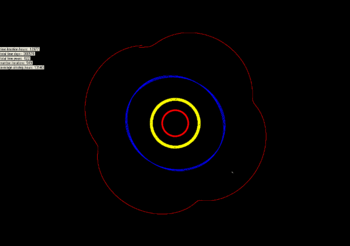 The libration of 2001 XH255. Jupiter in red, Saturn in yellow, and Uranus in blue. Neptune is the white dot at 5 o'clock.