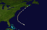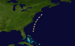 A tropical storm formed on September 9 to the northeast of the Bahamas. It tracked to the northwest before becoming a hurricane the next day and curving north. The hurricane never made a landfall and is only known from ship reports. The first ship known to have encountered the hurricane was the brigantine Frank W. on the night of September 8 and the morning of September 9. Also on September 9, the Mary Ann was dismasted. At Bermuda at least three ships docked which had sustained damage in the hurricane off the southeast end of the island on September 11. Further north, the bark Machae was dismasted on September 14. The hurricane dissipated to the northeast of Newfoundland on September 16.[2]