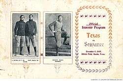 The train carrying the players pulled into Austin on the night of the 8th to face the undefeated Texas Longhorns the following afternoon. Sewanee won 12 to 0. Sewanee scored five minutes into the first quarter, and a minute before the end of the game, "and the intervening time was devoted to the liveliest battle ever witnessed here".[16] Diddy Seibels played throughout the game, scoring both touchdowns, despite his head having split open just above his left eye, bleeding profusely. By the end of the game his head was coated with blood.[16]