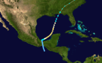 A tropical depression developed in the Pacific Ocean while located about 105 miles (169 km) west-southwest of Tapachula, Chiapas on October 3. The depression moved slowly north-northwestward and made landfall in a rural area of southeastern Oaxaca early the next day. On October 5, the system reached the Gulf of Mexico and soon intensified into a tropical storm. Thereafter, it curved east-northeastward and strengthened into a Category 1 hurricane by October 6. Early the next day, the storm became a Category 2 hurricane and peaked with maximum sustained winds of 105 mph (165 km/h) and a minimum barometric pressure of 970 mbar (29 inHg).[3]