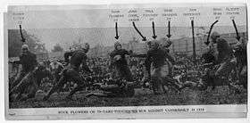 - ↑ Although Georgia Tech's teams are officially known as the "Yellow Jackets", northern writers called the team the "Golden Tornado" in 1917; the name was commonly used until 1928 and for many years afterwards as an alternate nickname.[1] It may have been coined by Morgan Blake.[2]
