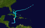 The seventh tropical storm of the season was first observed in the eastern Caribbean on August 14. It strengthened to reach winds of 45 mph (72 km/h). After passing just south of Jamaica, the storm turned to the northwest and crossed over both the Isle of Youth and western Cuba on August 18. It curved northward and dissipated west of Florida on August 21.[5]