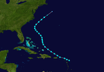 On October 11, a tropical storm was first detected over the Lesser Antilles. It moved westward, reaching hurricane strength the next day. The hurricane turned due northward and moved through the Mona Passage on October 15. It wouldn't change direction much for the remainder of its lifetime. Early the next day, the hurricane reached a peak of 110 mph (180 km/h) winds, which it maintained before weakening dramatically early on October 17. The hurricane became extratropical later that day, and moved inland near the Maine/New Brunswick border, dissipating over Canada.