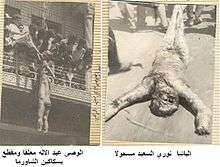 Mob violence was to continue even in the wake of Said's death. Spurred by Arif's urges to liquidate traitors,[24] uncontrollable mobs took to the streets of Baghdad. The body of 'Abd al-Ilah was taken from the palace, mutilated and dragged through the streets, finally being hung outside the Ministry of Defence. Several foreign nationals (including Jordanian and American citizens) staying at the Baghdad Hotel were killed by the mob. Mass mob violence did not die down until Qasim imposed a curfew, yet this did not prevent the disinterment, mutilation, and parading of Said's corpse through the streets of Baghdad the day after its burial.[27]