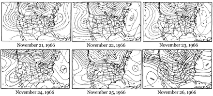 In November 1966, New York City was experiencing unseasonably warm "Indian summer" weather.[3] An anticyclonic thermal inversion[16] — in other words, a stationary, warm mass of air — formed over the East Coast on November 20.[15] Inversions can act like a lid, preventing the usual process of lower, warm air rising.[17] Such weather events are common, and they are usually followed by a cold front that blows them away; in this case, the cold front approaching west through southern Canada was delayed.[15]
