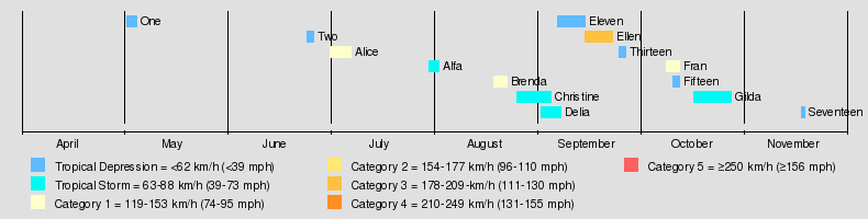 The season officially began on June 1, 1973, and lasted until November 30, 1973. These dates conventionally delimit the period of each year when most tropical cyclones form in the Atlantic basin.[3] However, the first system formed on April 18, more than a month before the official start. Three more depressions formed before June 1; however, none attained storm intensity. The first named storm of the year was Hurricane Alice which formed on July 1 and became the first known cyclone to affect Bermuda during July. More than a month later, the second hurricane, Brenda, formed and was considered the worst storm to strike Mexico along the eastern coast of the Bay of Campeche, killing 10 people.