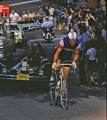 The whole starting peloton stayed intact for the first lap which took only 18' 36" to complete.[9] The first attack came from French rider Francis Campaner.[2][9] He managed to earn a 37" advantage as he finished the second circuit and he increased that lead to 1' 19" at the conclusion of the third lap.[2][9][10] Behind, the chasing group was led by Francesco Moser, Eddy Merckx, and Felice Gimondi.[9] After the fourth lap, Campaner had gained thirty more seconds on the peloton.[9] The gap between Campaner and the main field reached its maximum after the fifth lap — at 2' 21" — and was reduced to 1' 36" with the finishing of the sixth circuit.[9]