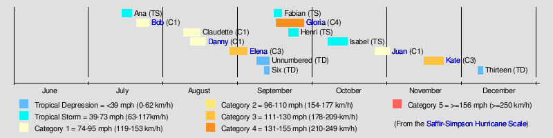 Hurricane Kate (1985) Hurricane Juan (1985) Hurricane Gloria Hurricane Elena Hurricane Danny (1985) Hurricane Bob (1985) Saffir-Simpson Hurricane Scale