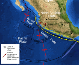 Much of Mexico's volcanic and seismic activity stems from the movement of the North American plate against the Cocos and Pacific plates and it is one of the most active trenches in the world.[2] Each year more than 90 tremors above magnitude 4.0 are recorded in this zone.[3]