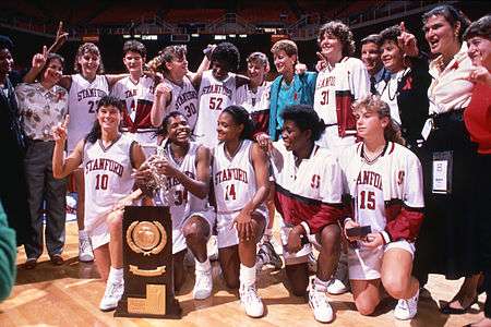 Over twenty thousand people bought tickets for the championship game in Knoxville, the largest crowd ever (at the time) to watch a women's basketball game.[5] In 1985, Stanford head coach Tara VanDerveer had traveled to Knoxville to meet with the family of Jennifer Azzi, to try to persuade Azzi to come to Stanford. Despite finishing 9–19 the year before, VanDerveer talked about competing for a National Championship, Azzi came to Stanford, and four years later, was twenty miles from her Oak Ridge hometown, playing for the National Championship. Auburn, led by Caroline Jones, pulled out to a nine-point lead in the first half. Then Azzi, who had not been able to even take a shot in the first eleven minutes, took over. She brought the team to a tie at halftime, and helped lead a 9–2 run early in the second half to take over the game. Azzi would win the tournament award for the most outstanding player, and her teammate Katy Steding set three point shooting records to help Stanford win their first National Championship 88–81, while Auburn would finish as runner-up for the third consecutive year.[6]