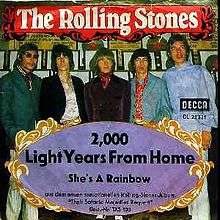 "2000 Light Years from Home" is a song from The Rolling Stones' 1967 psychedelic rock album Their Satanic Majesties Request.[1] Written by Mick Jagger and Keith Richards, it also appeared as the B-side to the American single "She's a Rainbow", and charted as a single in Germany. Jagger reportedly wrote the lyrics in Brixton prison following his conviction on drug charges in June 1967.[2] The song was recorded by the band inside Olympic Studios during July 1967. The working title of the instrumental backing was "Toffee Apple". The prominent string part is played by Brian Jones on Mellotron.