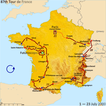 The Tour started with an individual time trial in Futuroscope (not an official prologue because it was longer than 8 km)[3] and ended, traditionally, in Paris. The distance travelled was 3663 km (counter-clockwise around France). The Tour passed through Switzerland and Germany.