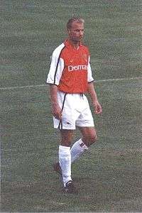 The team could only manage a draw against Chelsea on 8 September 2001, in a game described by The Guardian writer David Lacey as one where "the teams simply battered away at each other until one cracked."[29] Henry scored the winning goal away to newly promoted outfit Fulham; the 3–1 victory moved Arsenal to the top of the league for the first time in the campaign.[30] Against Bolton Wanderers, Arsenal was held to a 1–1 draw after Jeffers goal was cancelled out by Michael Ricketts.[31] A win at Derby County, where Henry scored two goals[32] was followed by an identical scoreline against Southampton at the new St. Mary's Stadium.[33] At home to Blackburn Rovers, midfielder Keith Gillespie gave the visitors the lead, before Pirès equalised and Bergkamp put Arsenal in front.[34] A mistake by Lauren presented David Dunn the chance to shoot "from 25 yards" and score.[34] Henry's controlled effort looked to have been the winner for Arsenal, until a pass by Tugay caused goalkeeper Wright to "race out of his goal" – the loose ball was collected by Dunn who shot into the empty net.[34] Although Wenger was disappointed with the manner of the defeat, he saw some encouragement: "What's positive for everyone is that Manchester United are dropping points as well. But we need to rectify the fact we concede goals at home."[35] October ended with a draw against Sunderland, where notably former Arsenal player Stefan Schwarz equalised for the home side and Patrick Vieira missed a penalty.[36]