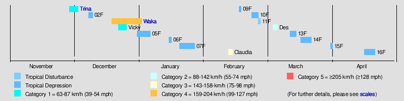 | Waka | December 19 – January 2 | Category 4 Tropical Cyclone | 185 km/h (115 mph) | 930 hPa (27.46 inHg) | Wallis and Futuna, Niue, Tonga, New Zealand | $51.3 million | 1 | |