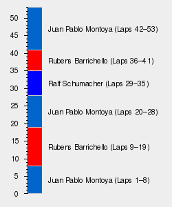 Montoya maintained his start-line advantage and led until he was passed by Barrichello on the ninth lap. Barrichello pulled away from Montoya and held the lead until his one and only pit stop on lap 19 which proved problematic because of a faulty refuelling rig. Montoya was utilising a one-stop strategy and made a pit stop on lap 29, which allowed his teammate Ralf Schumacher to lead for six laps. Barrichello regained the lead on lap 36, until Montoya took over the position on lap 42 when Barrichello made a pit stop for the second time. Barrichello started to reduce the gap between himself and Montoya but was unable to challenge the Williams driver who won his first Formula One victory.