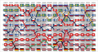 Eight nations have achieved a top ten ranking every time (including Olympic rankings) between 2003–16, they are (in order of average ranking): Sweden, Canada, Russia, Finland, Czech Republic, the United States, Slovakia, and Switzerland. An additional four nations, Latvia (eleven times), Germany (ten times), Belarus (eight times), and Norway (five times) have been in the top ten at least once. As of 2016, three countries have accomplished a first-place ranking: Canada seven times, Sweden six times, and Russia four times. Sweden and Canada are the only nations to have achieved a top five ranking every time.