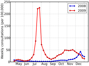 - ↑ "Weekly epidemiological update". Health Protection Agency. 22 October 2009. Archived from the original on 20 November 2009. Retrieved 25 October 2009.