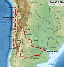 The 2010 Dakar Rally was the 31st running of the event. It was held in South America for the second successive time, and ran from 1 to 16 January. The Amaury Sport Organisation and the governments of Argentina and Chile agreed to a return to South America for the event in February 2009.[1][2]