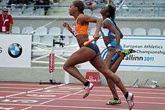 Jamile Samuel, the Netherlands (left), and Gloria Hooper, Italy (right), at the finish of the 4x100 m relay heat.