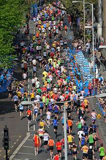 Around 35,000 people took part in the mass race and 35 Guinness World Records were set at the competition.[5] The majority of the records were for completing the fastest race in a certain costume, but others included the fastest couple and fastest parent-child pairings. German Uli Killian solved 100 Rubik's Cube puzzles whilst completing the race.[6] Steve Chalke, a Christian social activist, improved the record for the most funds raised for charity through a marathon run, raising £2.3 million for his Oasis Trust – beating his own record set at the previous year's race.[7] The largest age group present at the race were men in their 30s, followed by men in their 40s. The joint-youngest runners were Michael Bennett and Helen Nutter, both taking part on their eighteenth birthdays (the minimum allowable age), while the oldest participant was 87-year-old Paul Freedman.[8]