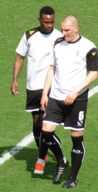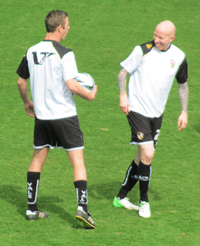 With the club's new owner in place, Adams signed six players early in July. He first signed midfielder Darren Murphy and winger Jennison Myrie-Williams (who had impressed in a loan spell at the club the previous season) from Stevenage, as well as Colchester United attacker Ashley Vincent.[2] He then made another triple swoop by bringing in Shrewsbury Town goalkeeper Chris Neal, Crewe Alexandra centre-back David Artell, and former Wales international Richard Duffy.[3] Highly rated striker Liam Dickinson, veteran forward Darren Byfield, and Irish attacker Tadhg Purcell also joined the club on trial.[4][5][6] Adams appointed Doug Loft as club captain at the end of July.[7] The pre-season tour of Ireland was hailed as a success, whilst Vale recorded wins in each of their encounters with non-league opposition.[8] However, David Artell left the club as a free agent days before the start of the season, as he refused to sign a contract that reflected the club's status as 'in administration' (the initial contract he signed listed Keith Ryder as the club's owner, and was therefore invalid).[9]