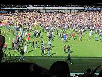 Vale were holding onto second place going into April, and though they failed to capitalize on their rivals dropping points on 1 April, they managed to come from behind to two Marc Richards goals at Chesterfield to secure a point. Four days later, Vale hosted fourth placed Burton Albion, in what was labelled as the biggest game of the season for the "Valiants".[41] Reduced tickets of £9 ensured a crowd of 10,978, and they were treated to a comprehensive 7–1 victory as Lee Hughes scored a hat-trick.[42] Bottom-placed Aldershot were the visitors four days later, and were seemingly fired up after manager Andy Scott took offense to Adams saying that "[Aldershot] are down the bottom because [they] deserve to be"; Scott stated that "Sometimes managers say things to deflect from what is going on at their own club. We will find out if they have got the stomach for the fight and see if they want to get promoted as they have got a few clubs chasing them."[43] The match proved to be low on action, and Vale surrendered a half-time lead to draw the game 1–1. On 12 April, it was confirmed that Burge had left the club by mutual consent.[44] Vale could have won promotion the following day, and seemed to have done so after Liam Chilvers made amends for a horrific first half own goal by heading Vale into the lead on 89 minutes; however an injury-time equalizer left the Vale still just short of their final target. Automatic promotion was effectively secured with a 2–2 draw against Northampton Town on 20 April, the two unlikely goalscorers were Chilvers and former "Valiant" turned "Cobbler" Lee Collins. Promotion was confirmed with a 1–1 draw with Wycombe at Adams Park on the last day of the season, in what was former favourite Gareth Ainsworth's last game as a player.