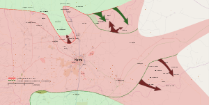 ![]() Frontlines in Hama Governorate during the offensive. Syrian Government control Opposition control Contested For a war map of the current situation in Hama, see here. | |||||||