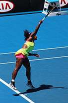 Shortly after winning the first Grand Slam of the season, Williams, in an exclusive column for TIME magazine, announced her intention to end her 13-year boycott of Indian Wells and return to the tournament for the first since winning the title in 2001.[20] Her highly anticipated opening match was set for 13 March when Monica Niculescu advanced to the second round. Williams' return to Stadium 1 at the Indian Wells Tennis Garden was welcomed with rapturous applause and a standing ovation from those in attendance, including tournament owner Larry Ellison, co-founder of Microsoft Bill Gates and tennis legend John McEnroe.[21] Despite the warm reception Williams was tense and was broken immediately by Niculescu, who went on to serve for the opening set in the tenth game, but Williams' resilience saw her win three consecutive games to take the set. In the second set, the pair traded breaks early on and, just as in the first set, the American got the decisive break in the twelfth game to win the match.[22] In the third round Williams made quick work of an error-strewn Zarina Diyas, losing only two games, concluding with a second set bagel.[23] In the round of 16, Williams faced compatriot Sloane Stephens. A sharp and engaged Stephens got an early lead, taking the first three games, but Williams responded by winning the next three to level the match. The set remained on serve with Stephens saving a set point in the tenth game to force it to a tiebreak, which the younger American won. Williams fought back breaking Stephens' serve a collective four times over the final two sets to advance to the final eight.[24] At the quarterfinal stage Williams took on an in-form Timea Bacsinszky whom advanced to the final eight off the back of winning back-to-back titles in Mexico. The Swiss led the opening set in its early stages, however, as in her opening match, Serena came from behind and claimed the first set, with the decisive break coming in the twelfth game. The second set started with four consecutive breaks of serve. Williams righted the ship with a break of serve in the eighth game, which she backed up by serving out the match to 15 to secure a spot in the semifinals. Williams finished the match with 23 winners to her opponents' 11, including 7 aces.[25] Williams was set to face world No. 3 Simona Halep at the semifinal stage but had to withdraw before the match due to a right knee injury.[26] After her withdrawal was announced to those in attendance Williams came out on to Stadium 1 court to address the crowd, apologize for her withdrawal and reassure fans that she would be back in 2016.[27]