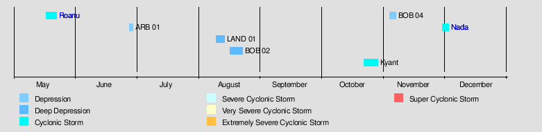The season officially started with the formation of Cyclone Roanu over in the Bay of Bengal on 17 May. The beginning of June witnessed no storms although a lot of low pressure areas formed over Bay of Bengal but none of these intensified into a depression. At the end of June, Depression ARB 01 formed but weakened within two days. July witnessed no storms until a deep depression formed in August under the influence of an upper air cyclonic circulation over Gangetic West Bengal. However, multiple low pressure areas occurred on the Bay of Bengal, with Cyclonic Storm Kyant forming in October.