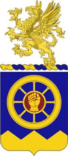 On the coat of arms, there is a crest above the shield. The crest consists of a golden and blue wreath on which stands a gold griffin. Atop the distinctive unit insignia is a brick red scroll inscribed "Wolf Hounds" in gold.