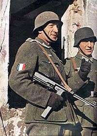 The original French unit in the German army was the Legion of French Volunteers Against Bolshevism (French: Légion des Volontaires Français contre le Bolchévisme, or LVF). The LVF was also known by its official German designation, the 638th Infantry Regiment (Infanterieregiment 638). The LVF was mainly recruited from Pro-Fascist Frenchmen and elements among French prisoners of war. The LVF received 13,400 applicants, but many were weeded out and 5,800 were placed on the rolls. The LVF while in France wore a French army style khaki uniform and on their collar was their battalion number below an inverted chevon or the LVF emblem.[5] Outside France they had to wear the standard German Army uniform with only a shield on the right upper arm with the colors of the French flag with the word France or LVF to distinguish it.[6] By October 1941, there were two battalions of 2,271 men which had 181 officers and an additional staff of 35 German officers. They fought near Moscow in November 1941 as part of the 7th Infantry Division. The LVF lost half their numbers in action or through frost-bite.[7] In 1942 the men were assigned to anti-partisan duties in the Byelorussian SSR (Belarus). At the same time, another unit was formed in France, La Légion Tricolore (Tricolor Regiment) but this unit was absorbed into the LVF six months later.[8]