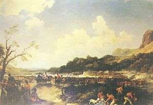 In April 1756 the regiment embarked from Ireland to America for service in the Seven Years' War.[15] The commanding officer of the regiment, Lieutenant-Colonel George Monro, led the defence of the Fort William Henry in August 1757 but was forced to surrender to the superior forces of General the Marquis de Montcalm. The British troops were allowed to leave the fort with their weapons but the Native American allies of the French set upon the retreating force killing several hundred of them including women and children.[16] The regiment also took part in the Siege of Louisbourg in July 1758 when several of the regiment's officers were wounded.[17] In September 1759 the regiment had its revenge on Montcalm when it fought under General James Wolfe at the Battle of the Plains of Abraham charging the French Regiment Royal Roussillon and picking up the Frenchmen's white plumes and placing them in their own headresses.[18] It saw action again at the Battle of Sainte-Foy where 12 of its men were killed in April 1760[19] and then took part in the Invasion of Martinique in January 1762.[20] The regiment departed with the British expedition against Cuba and was part of the besieging force which took Fort Morro in July 1762[21] and Havana in August 1762.[22] The following year it proceeded to Florida, which had been ceded by Spain to the United Kingdom, before returning to England in 1765.[23]