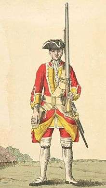 The regiment was raised in Belfast by Arthur Chichester, 3rd Earl of Donegall as the Earl of Donegall's Regiment of Foot or the Belfast Regiment on 28 June 1701 to fight in the War of the Spanish Succession. This was the second raising of the Earl of Donegall's Regiment: the previous regiment was raised in 1693 and disbanded on 8 February 1697: despite the names there was no lineal connection between them.[1][2][3] The regiment was a strongly Protestant unit tasked with resisting the spread of Roman Catholicism in Britain.[4] King William III, gave special permission for the regiment to bear orange facings to show their religious allegiance and as a mark of royal favour.[3][4][5]