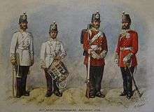 The regiment was sent to the Cape of Good Hope for service in the Fifth Xhosa War in 1818 and then to India in 1822 from where it was deployed to Burma for service in the First Anglo-Burmese War in 1824.[10] It returned to England in May 1836 and proceeded to Ireland in May 1837 before embarking for Zante in the Ionian Sea in September 1840.[10] It went on to Gibraltar in March 1843 and to Jamaica in November 1845 before proceeding to Halifax in April 1848.[10] After returning to England in August 1851, it was dispatched to the Crimea for service in the Crimean War in April 1854.[10] It took part in the Battle of Alma in September 1854, Battle of Inkerman in November 1854 and the Siege of Sevastopol in winter 1854.[11] The regiment then embarked for India in August 1857 and saw action at the Capture of Lucknow in March 1858 during Indian Rebellion.[11] It also took part in the expedition against the Black Mountain tribes in 1868 before returning to England in 1871.[2]