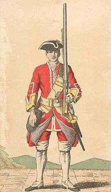 The regiment was raised a third time at Lichfield by General Luke Lillingston as Luke Lillingstone's Regiment of Foot in March 1705.[1] It was ranked as the 38th regiment in 1747.[1] It was posted to Ireland later in the year and then sent to the West Indies in 1707.[2] On 1 July 1751 a royal warrant was issued which provided that in future regiments would no longer be known by their colonel's name, but would bear a regimental number based on their precedence: the regiment became the 38th Regiment of Foot.[1] It returned to Ireland in 1764 and then went to Boston in Massachusetts in 1774.[2] It fought at the Battle of Bunker Hill in June 1775 and at the Battle of Brandywine in September 1777 during the American Revolutionary War.[2] The regiment took a county title as the 38th (1st Staffordshire) Regiment of Foot in 1782[1] and returned to Ireland in 1790.[3]