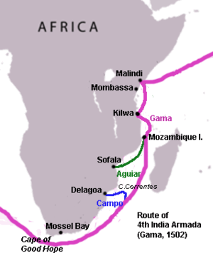 Approximate route of the 4th India Armada (1502) along the African coast, purple = route of main fleet (Vasco da Gama); green = side-trip of Pedro Afonso de Aguiar, blue = deviation of Antão Vaz do Campo