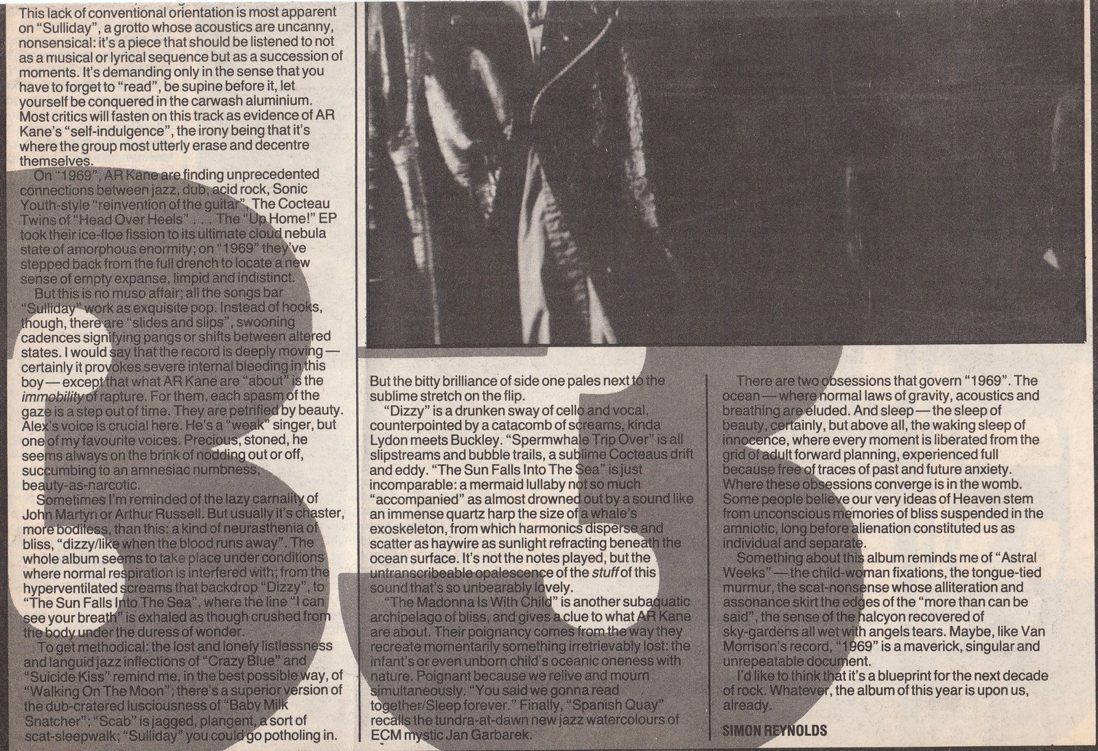 "This is no muso affair; all the songs bar "Sulliday" work as exquisite pop. Instead of hooks, though, there are "slides and slips," swooning cadences signifying pangs or shifts between altered states. I would say that the record is deeply moving−certainly it provokes severe internal bleeding in this boy–except that what AR Kane are about is the immobility of rapture. For them, each spasm of the gaze is a step out of time. They are petrified by beauty."