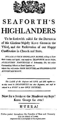 In 1771 the family title of "Earl of Seaforth" was restored to Kenneth Mackenzie after his family had forfeited it because of their involvement in the Jacobite Rebellion of 1715. As a gesture of gratitude, the Earl offered to raise a regiment on his estate for general use by the Crown. The offer was accepted and a corps of 1,130 men was raised. Of these, 900 were Highlanders and the remainder coming from the Lowlands and was located at Elgin, its first base, in May 1778.[1] In August 1778 the Regiment marched to Leith for embarkation to the East Indies but a dispute regarding their terms of service lead the men to march back to Edinburgh and they took up a position of protest in the vicinity of Arthur's Seat, remaining for several days. During this protest, the men were amply supplied with food and ammunition by the populace of the capital, who had taken side with them in their grievances. After three days of negotiations, compromises were reached and the men again marched from the capital to their quarters at Leith, this time led by the Earl of Seaforth, but the idea of sending them to India now having been abandoned. [Note 1] At this time, the Regiment was designated as the 78th Regiment of Foot.[2]