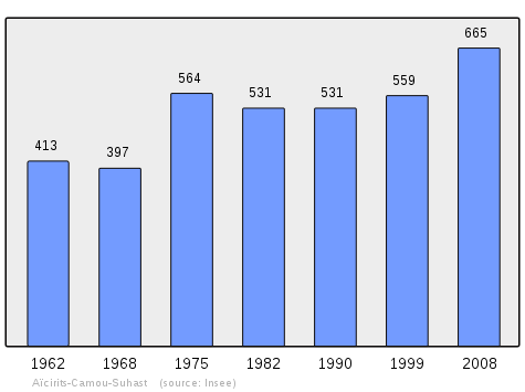 The fiscal census[15] of 1412 to 1413, made[16] on the order of Charles III of Navarre, compared to the one in 1551 "of men and weapons that are in the kingdom of Navarre outside the ports",[17] revealed a strong growth in population. The first census indicated at Aïcirits the presence of 4 fires, the second 13 fires (12 + 1 secondary fire). Similarly in Camou, the census reported in 1412-1413 10 fires, and that of 1551 31 fires (27 + 4 secondary fires). Finally at Suhast, the counts indicated 6 fires in the first census and 22 fires (21 + 1 secondary fire) for the second.