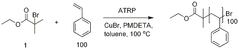ATRP usually employs a transition metal complex as the catalyst with an alkyl halide as the initiator (R-X). Various transition metal complexes, namely those of Cu, Fe, Ru, Ni, Os, etc., have been employed as catalysts for ATRP. In an ATRP process, the dormant species is activated by the transition metal complex to generate radicals via one electron transfer process. Simultaneously the transition metal is oxidized to higher oxidation state. This reversible process rapidly establishes an equilibrium that is predominately shifted to the side with very low radical concentrations. The number of polymer chains is determined by the number of initiators. Each growing chain has the same probability to propagate with monomers to form living/dormant polymer chains (R-Pn-X). As a result, polymers with similar molecular weights and narrow molecular weight distribution can be prepared.