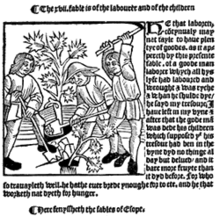 Some fables may express open scepticism, as in the story of the man marketing a statue of Hermes who boasted of its effectiveness. Asked why he was disposing of such an asset, the huckster explains that the god takes his time in granting favours while he himself needs immediate cash. In another example, a farmer whose mattock has been stolen goes to a temple to see if the culprit can be found by divination. On his arrival he hears an announcement asking for information about a robbery at the temple and concludes that a god who cannot look after his own must be useless.[95] But the contrary position, against reliance on religious ritual, was taken in fables like Hercules and the Wagoner that illustrate the proverb "god helps those who help themselves". The story was also to become a favourite centuries later in Protestant England, where one commentator took the extreme position that to neglect the necessity of self-help is "blasphemy" and that it is "a great sin for a man to fail in his trade or occupation by running often to prayers".[96] While scepticism remains, it is superstition rather than true belief that is the target.