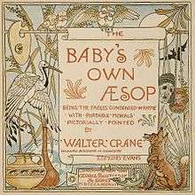 Sharpe was also the originator of the limerick, but his versions of Aesop are in popular song measures and it was not until 1887 that the limerick form was ingeniously applied to the fables. This was in a magnificently hand-produced Arts and Crafts Movement edition, The Baby's Own Aesop: being the fables condensed in rhyme with portable morals pictorially pointed by Walter Crane.[81]