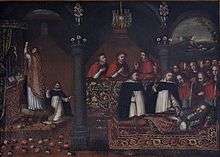 The wedding, by proxy, took place ten years later in the spring of 1490 in Seville.[7][8] On 19 November of that year, Isabella arrived in Badajoz where she was welcomed by Afonso's uncle, Manuel, the future King Manuel I of Portugal, whom she would eventually marry six years after her husband's death. Afonso and Isabella were reunited in Elvas on 22 November and, on the following day, Isabella met her mother-in-law, Queen Eleanor, in the Convento do Espinheiro in Évora, where the court had gathered to ratify the marriage that had been celebrated earlier in Seville.[9]