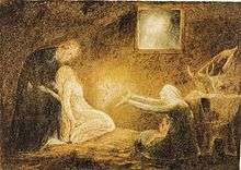 The Agony in the Garden is a small painting by William Blake, completed as part of his 1799-1800 series of Bible illustrations commissioned by his patron and friend Thomas Butts. The work illustrates a passage from the Gospel of Luke which describes Christ's turmoil in the Garden of Gethsemane before his arrest and Crucifixion following Judas's betrayal.[1] In Blake's painting a brilliantly coloured and majestic angel breaks through the surrounding darkness and descends from a cloud to aid and physically support Jesus in his hour of agony.[2] The work is dominated by vertical lines, formed both from the trees and from the two arms of the angel. Two inner lines converge on Christ's palms, evoking the nails driven through him during his crucifixion.