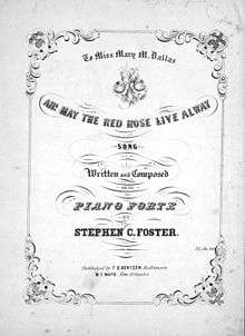 Ah! May the Red Rose Live Alway is a song written and composed by Stephen Foster in 1850. This song is written in the style of a parlor ballad - a genre of popular song at the time intended to be performed at a slow tempo and to communicate a sentimental quality.[1]