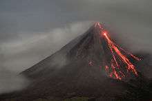 A seminal event in Alajuela's history was the 1968 eruption of Volcán Arenal.[12] Residents previously referred to it as Mount Arenal. In the years before the eruption, residents reported rises in the temperature of ground water and small tremors. Beginning on 28 July 1969, residents of surrounding towns reported constant tremors.[13] The eruptions began on 29 July, spewing ash into the neighboring provinces and launching boulders into the sky.[12] The initial explosions were so strong that three craters were instantaneously created.[13] The cities of Tabacón, Pueblo Nuevo and San Luís were buried, killing 87 people.[12] Crops were destroyed and livestock were killed.[12]
