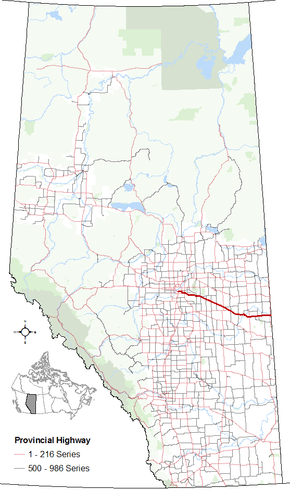 Alberta Provincial Highway No. 14 is an east-west highway through central Alberta. It spans from the City of Edmonton to the Alberta – Saskatchewan border. It runs parallel to the more northern Highway 16.[1]