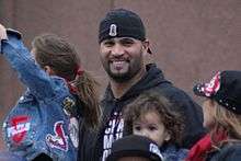 Pujols married his wife, Deidre, on January 1, 2000.[190] They have five children: Isabella (Deidre's daughter from a previous relationship), Albert, Jr., Sophia, Ezra, and Esther Grace.[191] During the offseason, they live in St. Louis.[192] Albert and his wife are supporters of people with Down syndrome, a condition Isabella was born with.[193] In 2007, Pujols became a U.S. citizen,[194] scoring a perfect 100 on his citizenship test.[195]